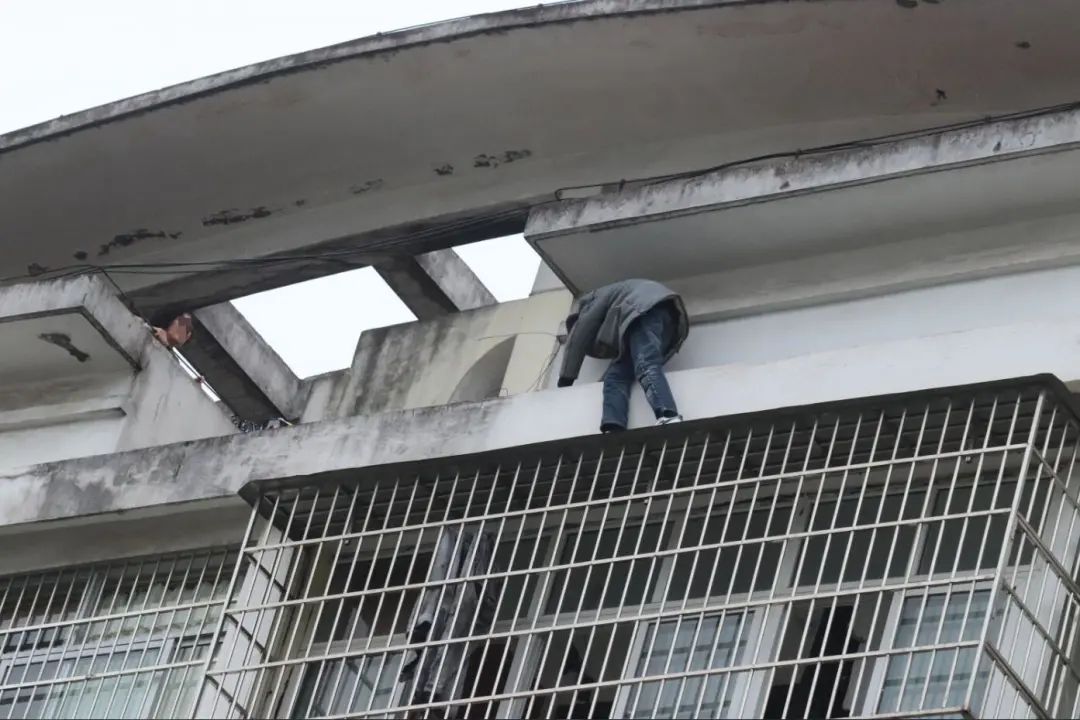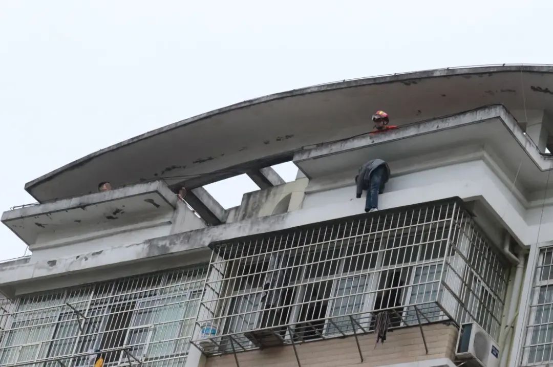 消防救援人员到达楼顶后,发现跳楼男孩情绪亢奋,不让任何人员靠近,一旦救援人员出现在他的视线内就会做出危险动作。该男孩的奶奶不间断对其进行劝说、安抚。最终,一位救援人员以速雷不及掩耳之势伺机从楼顶跳到檐边一把抓住正在移动的男孩,随后又有2位救援人员搭手把男孩抱上了楼顶。