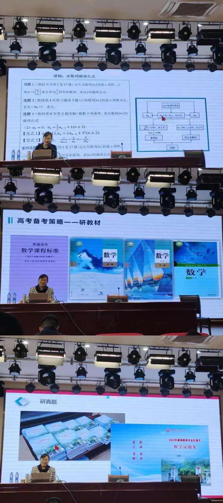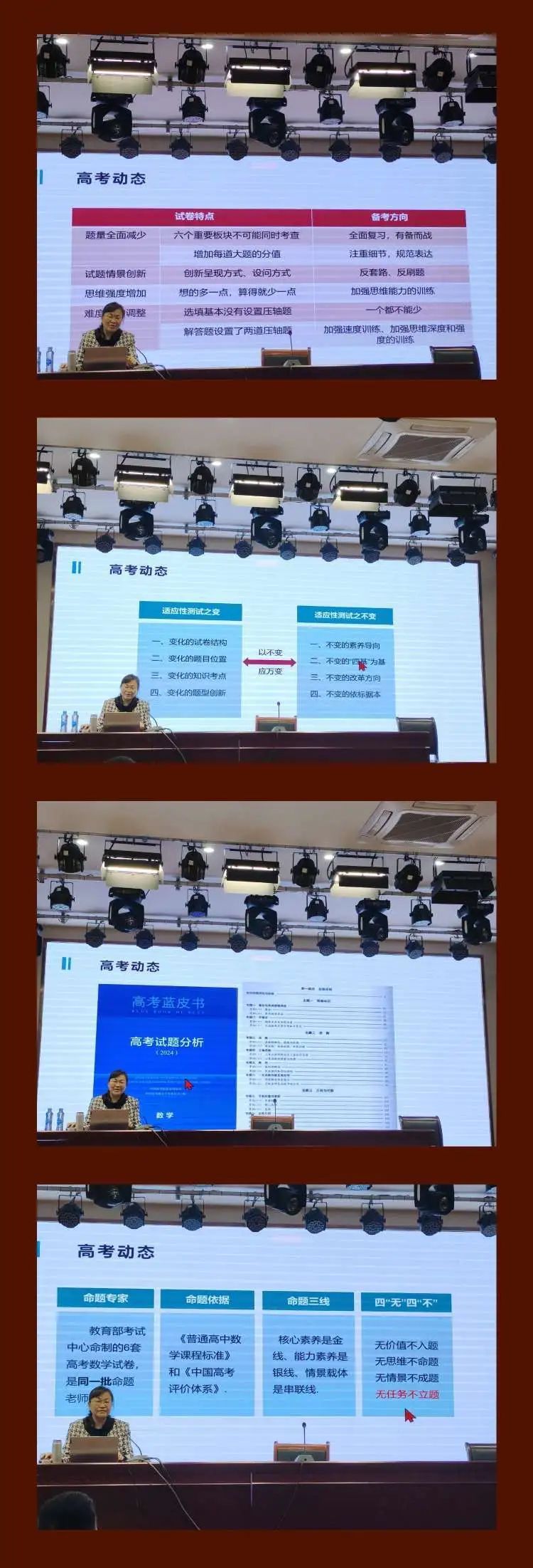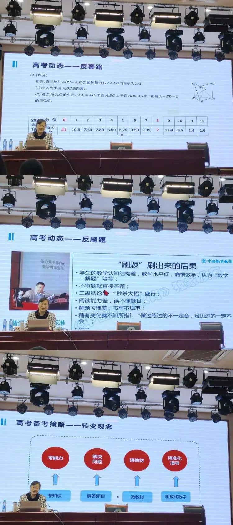 为进一步优化数学高考复习策略,提升数学复习备考的科学性和有效性,4月8日下午,芦溪中学于二部报告厅举办了2024年新高考数学复习策略讲座。大安中学、周敦颐学校和芦溪中学全体数学教师参加了活动,芦溪中学副校长韩远忠同志主持,长沙一中马罗主任主讲。 马罗主任凭借自己数十年丰富的高中数学教学经验和亮眼的高考教学成绩,结合大量的经典案例,首先针对适应性考试试卷的改革,包括题量、试题情景、思维强度、难度的调整,试题的各变化也指向我们的备考方向。 以预测命题走向即反刷题,反套路,转变学生学习观念和教师教学观念:从考知识向考能力的转变; 从解答题目到解决问题的转变;从教教材到研教材的转变;从粗放式教学到精准化指导的转变。 基于此,马罗主任提出:首先数学的学习和备考应该回归课标,回归课本,回归教材,重视教材和课标在教学中的作用,从教材出发合理利用教材习题及各种变式发展学生的思维能力;其次对教师应该着眼于真题,研究真题,给学生指明了高考将“考什么”、“怎么考”,学生现在的问题在哪里,应该怎样做。再次就教材与真题的结合方面指导教师在日常教学通过精选例题如何对学生进行思维训练,向学生呈现知识框架。 讲座从方向,阶段和落实三个方面探讨高考备考策略,既有思想高度,又有思考深度,还有学识广度,更有现实温度,既体现了马罗主任的爱生如子真挚深切的教育情怀,又反映了化繁为简返璞归真的教育智慧。与会人员听得非常认真专注,都感到很有收获、很受启发! |