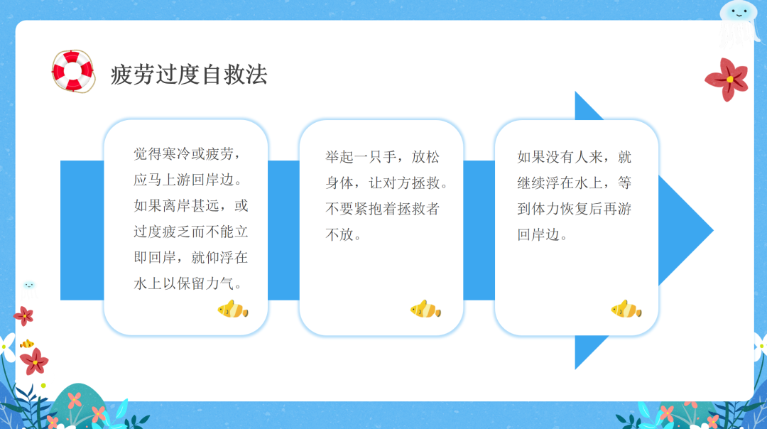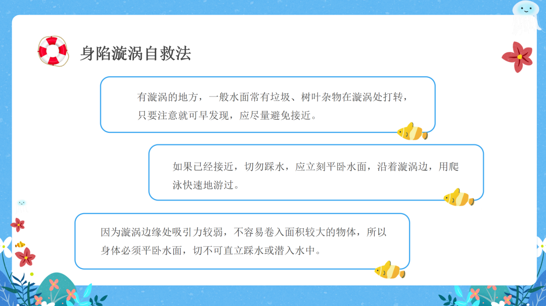 身陷漩涡自救法 疲劳过度自救法 善水者溺于水,游泳本领再高,也要远离江河湖泊等野外水域!切勿以为自己会游泳,在水中就很安全。 他人溺水如何施救 发现有人溺水的正确措施 1.立即大声呼救,寻求大人帮助。拨打110、119、120等紧急求助电话。在呼救的同时迅速扫视四周,看有无可利用的救援工具。 2.将树枝、木棍、竹竿等递给落水者、拉其靠岸。 3.将救生圈、水桶、充气的塑料袋、球类或长绳、衣物等抛给落水者,助其漂浮待援或将其拉回岸边。 下肢抽筋预防 1.游泳前一定要做好暖身运动。 2.游泳前应考虑身体状况,如果太饱太饿或过度疲劳,不要游泳。 3.游泳前先在四肢撩些水,然后再跳入水中。不要立刻跳入水中。 防溺水安全倡议 对自己负责 树立安全意识,加强自我保护。绝不参与危险的戏水游泳活动,绝不参与没有家长陪同的游泳活动,绝不到危险、陌生的河塘游泳,绝不在河塘边垂钓鱼虾,绝不做危险举动,绝对远离溺水杀手。 对家人负责 如果游泳,一定要在自己的家长陪护前提下,到安全的、正规的游泳场所游泳,并要做好相应准备活动,防止溺水事件的发生。 对他人负责 在加强自我安全意识的同时,要努力做好说服教育工作,对于那些违反学校纪律,私自外出游泳的行为,要坚决抵制、劝阻。 |