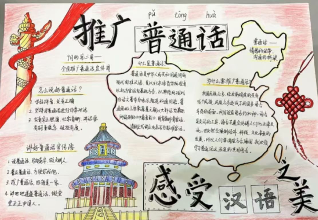 在这个多彩的世界里,每一种语言都是独特的风景,而普通话,则是我们共同的家园之音。为扎实开展好第27届推普周活动,引导全校师生及家长持续增强自觉规范使用国家通用语言文字的意识,大力弘扬爱国主义精神,树立高度的文化自觉与文化自信。湘东镇御泉湾小学开展了系列普通话推广活动! 湘东镇御泉湾小学利用学校电子屏作为前沿阵地,滚动播放“加大推普力度,筑牢强国语言基石”的醒目标语,不仅点亮了校园的文化风景线,更营造出了加大推普力度、筑牢强国语言基石的浓厚氛围,展现了学校对语言文字工作的高度重视和坚定决心。 为进一步深化推普工作,御泉湾小学精心策划并全面实施了深入推普的“七个一”系列活动,这些活动如同七颗璀璨星辰,照亮了学生们探索中华优秀传统文化的道路,激发了他们强烈的民族自豪感。 在庄严的国旗下,一场激昂的讲话拉开了活动的序幕,号召全体师生共同为推广普通话贡献力量;主题班会上,学生们围绕普通话与文化的关系展开热烈讨论;啄木鸟行动中,学生们化身为语言文字的守护者,发现并纠正身边的错别字;经典诵读会上,学生们用稚嫩而坚定的声音诵读着中华经典,让传统文化在校园里流淌;汉字听写大赛中,一场智慧的较量让学生们在比拼中领略汉字的魅力;手抄报制作中,学生们挥洒创意,将推普的热情与对中华文化的热爱融入纸间;而教师们则以规范的板书为榜样,默默传递着语言文化的精髓。 这一系列丰富多彩、并线推进的活动,不仅加深了学生们对普通话重要性的认识,还让他们在参与中亲身体验到了中华优秀传统文化的博大精深,从而增强了民族自豪感和文化自信。未来,湘东镇御泉湾小学将继续深化推普工作,为培养更多具有深厚文化底蕴和高度语言素养的新时代少年而不懈努力。 |