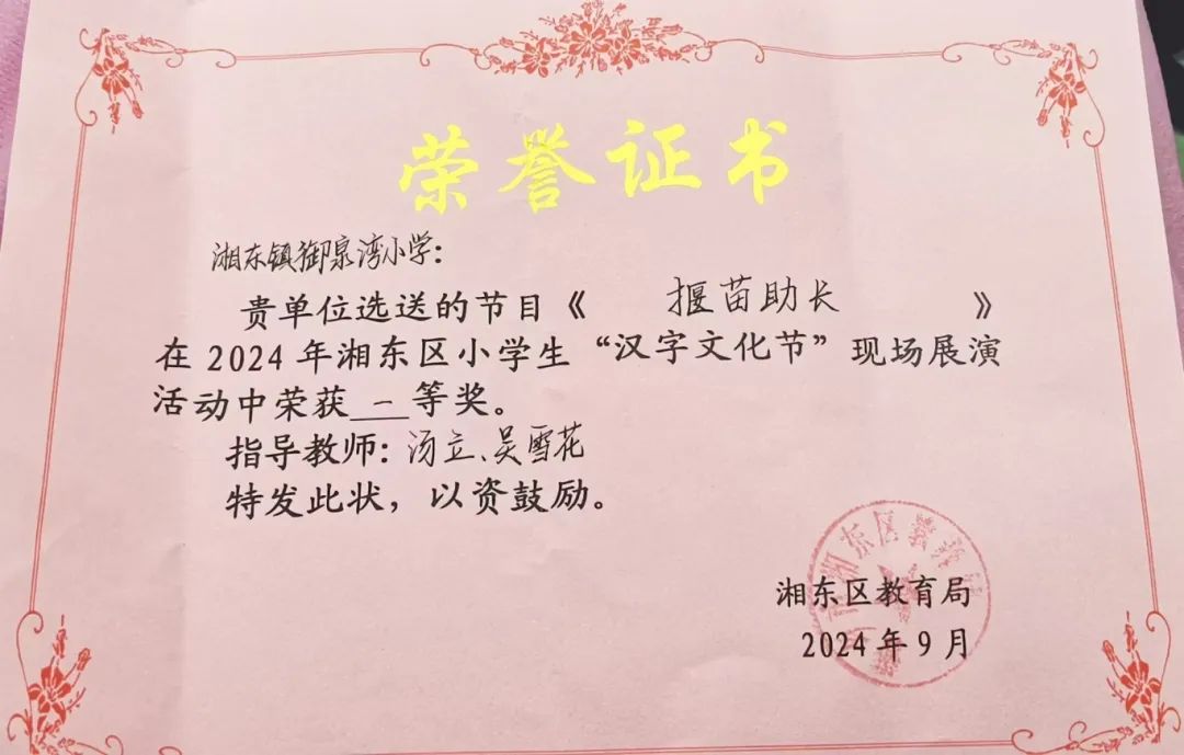 热烈祝贺湘东镇御泉湾小学选送的课本剧《揠苗助长》在2024年湘东区小学生“汉字文化节”现场展演活动中荣获一等奖。