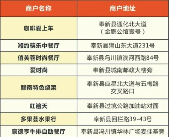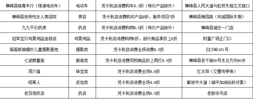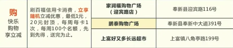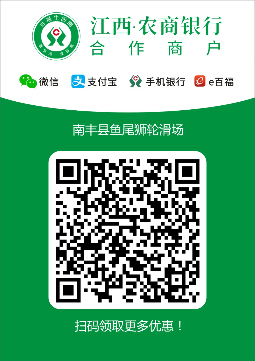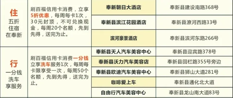 ◆ ◆ ◆ 你要问我挣钱为了什么 有人为了生存 有人为了生活 作为新时代消费达人 要快乐就跟着小商看过来 超级划算快来! 即日起江西辖内农商银行客户 即可享受 美食、生活、娱乐、教育等 多重优惠活动 江西辖内农商银行优惠活动集合 美食篇 1奉新农商银行 活动时间: 2020年6月1日至2020年12月31日 活动内容: 美食五折:刷奉新农商银行百福信用卡消费 ,每周五至周日消费立享5折优惠,每周每卡一次,每周60个名额,先到先得。 活动商户: 3横峰农商银行 活动时间: 2020年5月1日至2021年4月30日 活动内容: 持横峰农商银行百福卡(含社保卡)在百福生活圈商户消费 ,可享优惠折扣。 活动商户: 4兴国农商银行 活动内容: 刷兴国农商银行百福信用卡、储蓄卡在指定商户消费,可享优惠折扣。 活动商户: 生活篇 1奉新农商银行 活动时间: 2020年6月1日至2020年12月31日 活动内容: 住宿五折:刷奉新农商银行百福信用卡消费 ,每周五至周日消费立享5折优惠,每周每卡一次,30元封顶,每周20个名额,先到先得。 活动商户: 2兴国农商银行 活动内容: 洗车8折:刷兴国农商银行百福信用卡、储蓄卡在车镇洗车功商户洗车、保养、美容,可享8折优惠。 3横峰农商银行 活动时间: 2020年5月1日至2021年4月30日 活动内容: 持横峰农商银行百福卡(含社保卡)在百福生活圈商户消费 ,可享优惠折扣。 活动商户: 娱乐篇 1赣州农商银行 活动时间: 2020年7月15日至2021年7月14日 活动内容: 信用卡客户 一:客户持赣州地区辖内农商银行信用卡在赣州极地海洋世界购买门票,每张门票在当日挂牌价格上立减40元。(每张信用卡一年享受立减优惠购票不超过3张,超过3张时,每张门票享受当日挂牌价格的8.5折)。 二:客户持江西辖内农商银行(赣州地区辖内农商银行除外)信用卡在赣州极地海洋世界购买门票,每张门票享受当日挂牌价格的8.5折优惠。 储蓄卡、公务卡、社保卡客户 客户持江西辖内农商银行储蓄卡、公务卡和社保卡在赣州极地海洋世界购买门票时,每张门票享受当日挂牌价格的8.5折优惠。 2奉新农商银行 活动时间: 2020年6月1日至2020年12月31日 活动内容: 刷奉新农商银行百福信用卡消费,立享五折优惠,每周每卡一次,35元封顶,每周20个名额,先到先得。 活动商户: 3会昌农商银行 活动时间: 2020年8月1日至2020年9月30日 活动内容: 刷会昌农商银行信用卡、储蓄卡、社保卡到月季园水上世界购买12次游玩卡,享立减30元优惠,折后价128元。 4兴国农商银行 活动内容: 刷兴国农商银行百福信用卡、储蓄卡在指定商户消费,可享优惠折扣。 活动商户: 教育篇 1吉安农商银行 活动内容: 9.9元体验3次高端课程:吉安农商银行百福借记卡、信用卡客户,添加客服微信,扫商户聚合支付二维码,付款9.9元,即可体验3次高端击剑定制课程(仅限60名)。 以上活动只可参与其一,每名客户限享一次优惠! 联系方式:18000262241 (刘店长) 商户地址:吉安市城南铜锣湾广场二期居正国际击剑俱乐部 2南丰农商银行 活动内容: 客户关注扫描下方二维码即可领取优惠券,凭券可在指定商户消费享受专属优惠,已领取的优惠圈可在江西南丰农商银行微信公众号回复“优惠”查询,数量有限,先到先得。 扫码领券