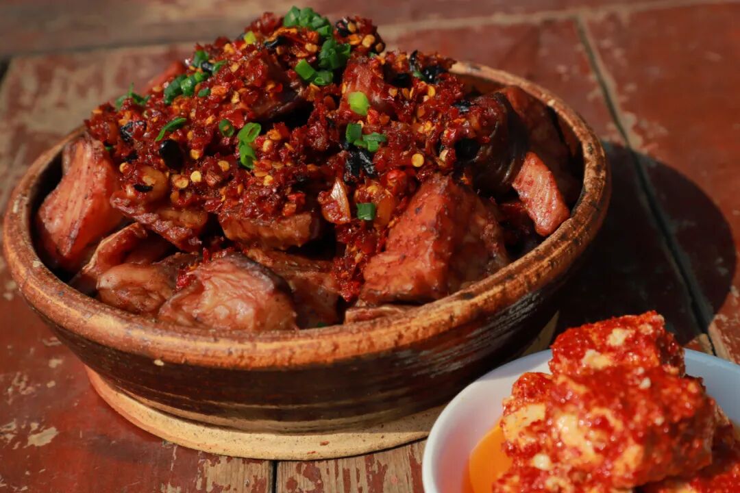 半个月后 鱼肉变得色泽鲜红、味道浓郁 加入特制的辣椒油 也可选用蒜蓉、辣椒粉、豆豉混合热油调制 淋在扎鱼表面 放入柴火灶上蒸20分钟 揭盖,一道口味独特的蒸扎鱼就喷香出笼了 飘出的香味真是令人垂涎三尺 “还是记忆中的味道” 撒入葱花就可以吃了