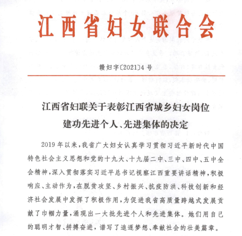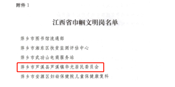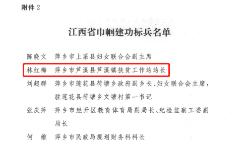 近日,省妇女联合会公布了《关于表彰江西省城乡妇女岗位建功先进个人、先进集体的决定》,芦溪镇华光居委会、芦溪镇扶贫工作站站长林红梅分别荣获省巾帼文明岗、省巾帼建功标兵。