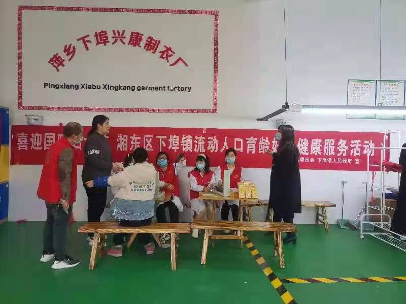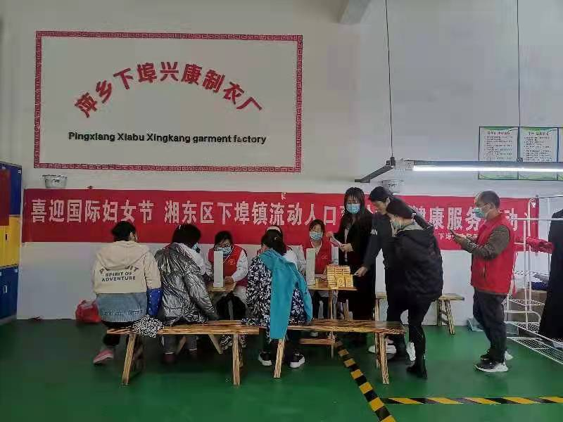 3月4日,为庆祝国际劳动妇女节,营造良好的节日氛围,进一步增强女性自我保健意识以及妇女同志的法治意识和维权意识。下埠镇社会事务局联合下埠卫生院来到萍乡下埠兴康制衣厂开展“喜迎国际妇女节”,湘东区下埠镇流动人口育龄妇女健康服务活动,此活动利用悬挂横幅,测血压、设立咨询台、免费发放避孕药具、发放宣传资料、免费发放卫生院体检卡等多种形式,并详细讲解了常见妇科疾病、乳腺癌、子宫颈癌预防、疫情防控等知识,让大家在轻松的氛围中加深对妇科疾病的了解,提高自我预防和保健意识。活动现场发放宣传资料100余份,发放避孕套500只,接受咨询80余人、发放免费体检卡40余张。深受企业员工的好评。