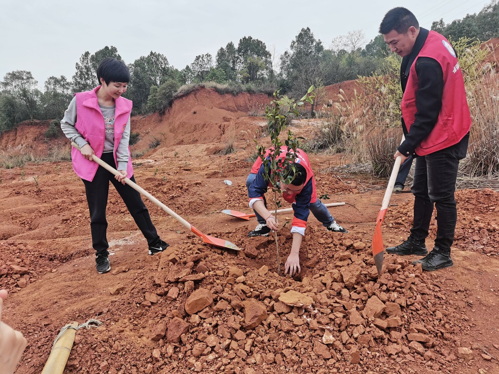 植树现场,大家热情洋溢,干劲十足,纷纷拿起铁锹、锄头等工具,三五一群,移苗入坑,扶苗对齐,挥锹填土,踩实压紧,每一道植树工序都做得认真到位,现场一片忙碌的景象。经过大家的努力,一颗颗小树苗在太阳下迎风挺立,为原本光秃秃的土坡穿上绿色“新衣”。