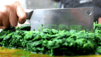 烫滚三五分钟后捞出来滤干水、剁细, 就可以做艾米古啦, 艾叶和米粉按1:1的比例糅合, 可加入适量清水。
