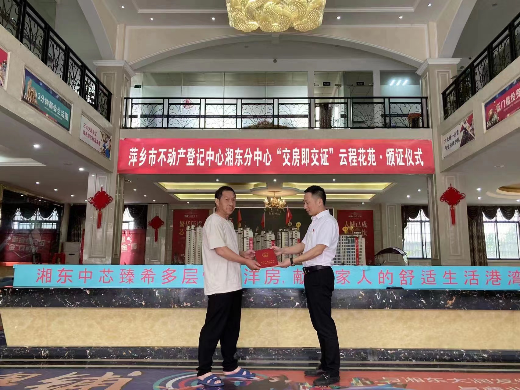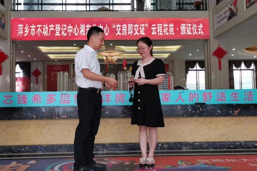6月30日,萍乡市不动产登记中心湘东分中心在萍乡市东鑫房地产开发有限公司售楼部举行了首批“交房即交证”颁证仪式,刘先生、周女士等几位业主们成为首批体验“交房即交证”新试点的受益者。 对于每一户家庭来说,买房是件大事,不动产权证就像是房子的“身份证”,拿到证是群众的迫切需求。长期以来,市民购买的商品房交付使用后,一般都需要一定时间才能拿到不动产权证书,如遇开发商未能按规定办理规划或是竣工验收等情况甚至还有不少购房人多年都无法拿到产权手续,给子女入学、资产处置、抵押贷款等造成障碍,影响了购房业主的合法权益。为认真贯彻落实市政府关于深化“放管服”改革、进一步优化营商环境决策部署,落实“为群众办好事,让群众好办事”的服务理念,萍乡市不动产登记中心湘东分中心开展了“交房即交证”试点工作,实现了购房业主的居住权与房产权同步到位,进一步维护了开发企业和购房人的合法权益。 在发证仪式上,业主刘先生上台满心欢喜地领取了不动产权证,表示道:“一直以来我们业主的期望就是住上好房子,享受好服务,今天我们真切的感受到了政府好政策带来的优质服务,拿到了不动产权证,真是既开心又安心,感谢不动产中心推出的这项惠民政策!”