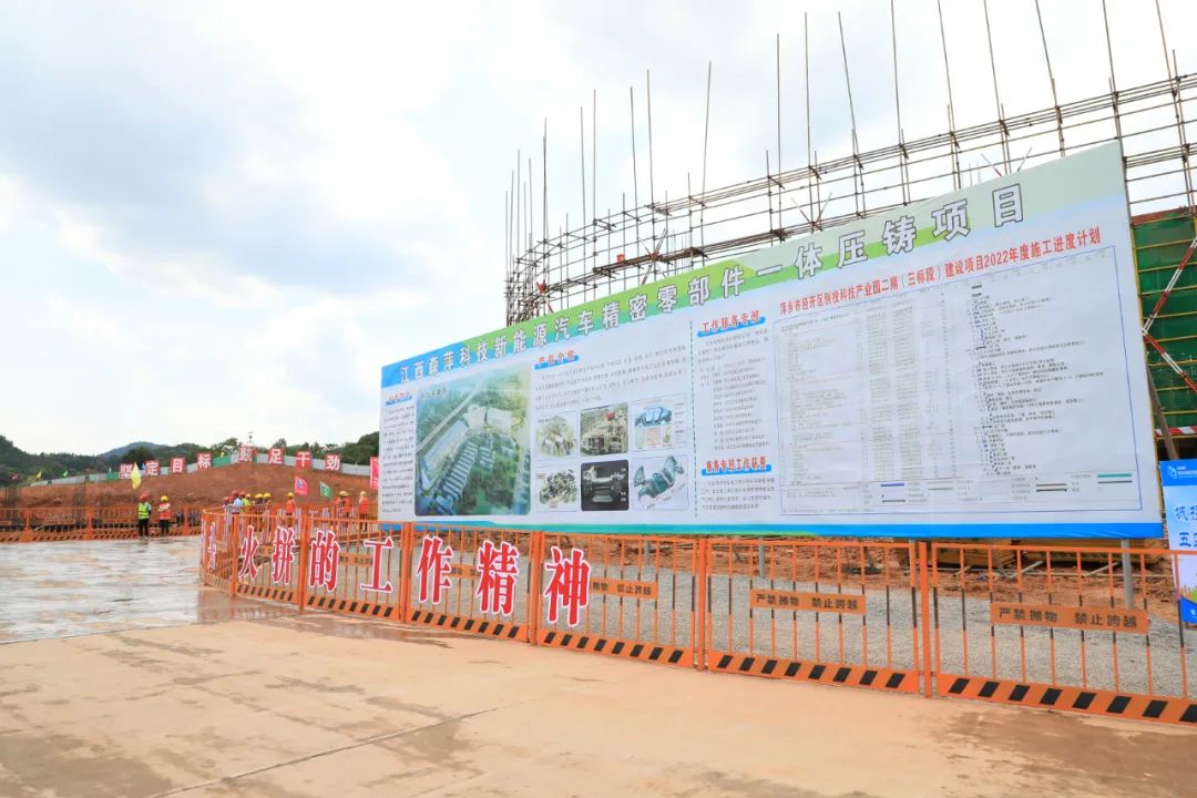 江西森萍科技新能源汽车精密零部件一体压铸项目 项目坐落于萍乡经开区清泉村,项目总投资50亿元,总占地面积250亩,总建筑面积20万平方米,用电装机容量共计20000KW,总计算负荷为10000KW,规划建设单体钢架厂房5万平方米,多层标准厂房12万平方米。生产设备包括160吨至12000吨压铸机60台、大型CNC加工中心800台以及喷油喷粉生产线和周边配套设备。项目分两期建设,其中一期投资30亿元(含设备投资13.5亿元),占地约150亩,总建筑面积107166平方米,规划建设单体钢架厂房3万平方米,多层标准厂房6万平方米。项目于今年5月开始施工,一期计划两年内全部建成投产,年销售收入可达70亿元以上,税收2亿元