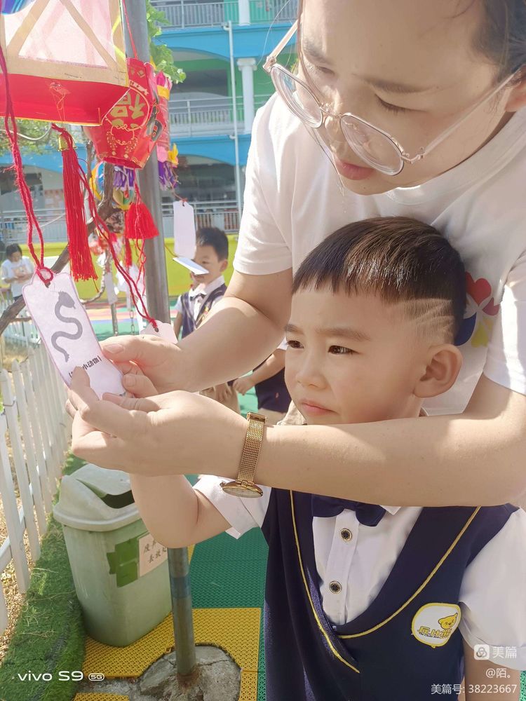 中秋灯笼高高挂,小朋友们认真的看着灯谜,开动脑筋,思考谜底。